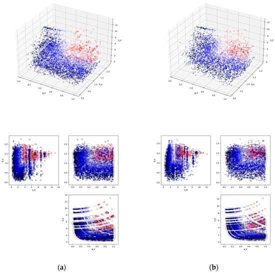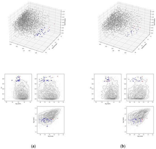 Based on the results of Figure 2, we examined the food improvement potential frontier and the recipe improvement potential area with τ = 0.3. Figure 3 shows the distribution of set and set in the space of the three complementarity measures for food combinations. Each point represents a combination of two foods, with blue markers representing set and red markers representing set .