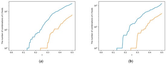 Figure 2 shows the relationship between the number of elements in set in Equation (7) and set in Equations (7) and (8), and the parameter τ based on the configuration of females aged 50 and above (see Supplementary Figure S4 for the other groups). The horizontal axis represents τ, and the vertical axis represents the number of food combinations. The blue line indicates the number of elements in set , and the red line represents the number of elements in set .