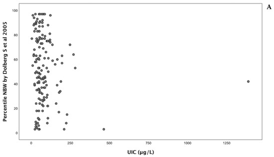 An assessment of UIC values relative to the extremes of birth weight percentiles, both above 90% and below 10%, was also conducted. No statistically significant differences were found in the UIC values across these groups, with p = 0.232 for newborns above the 90th percentile and p = 0.264 for newborns below the 10th percentile, as presented in Table 3.