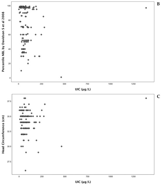 Spearman’s correlation coefficient revealed no statistically significant relationship between UIC and the examined anthropometric measures. For weight, the correlation coefficient between UIC and birth weight (g) was −0.109, and the coefficient between UIC and Dollberg et al. percentiles was −0.124 (Figure 1A). For length, the correlation coefficient between UIC and length (cm) was −0.142, and the coefficient between UIC and Davidson et al. percentiles was −0.147 (Figure 1B). The correlation coefficient between UIC and head circumference (cm) was −0.004 (Figure 1C).