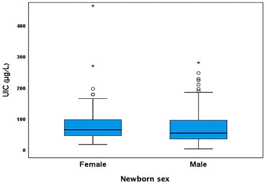 UIC values categorized by newborn sex. UIC = Urinary Iodine Concentration. Small circles represent mild outliers; asterisks represent extreme outliers.