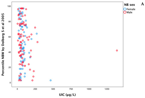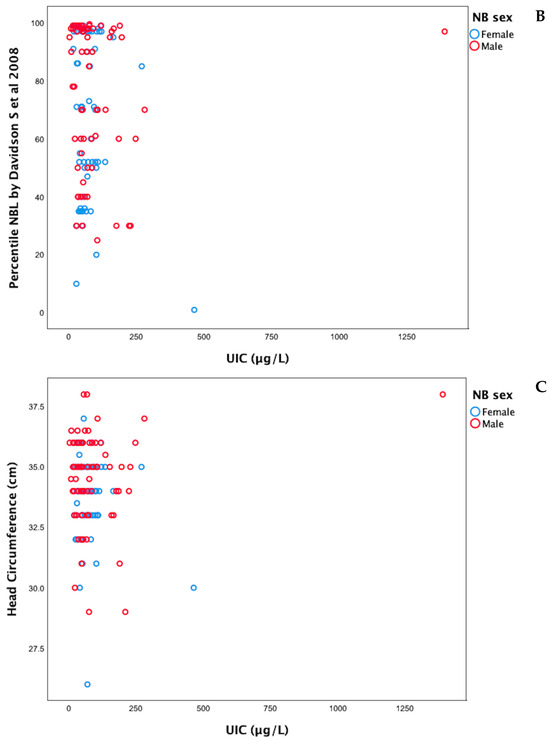 Correlations between UIC and weight percentile (A), length percentile (B), and head circumference (C) of newborns by sex. UIC = Urinary Iodine Concentration, NBW = Neonatal Birth Weight, NBL = Neonatal Birth Length [16,17].