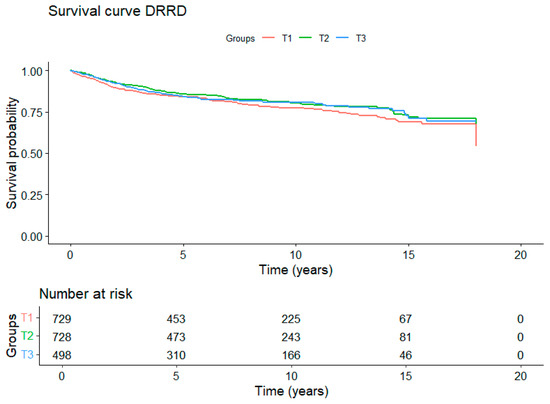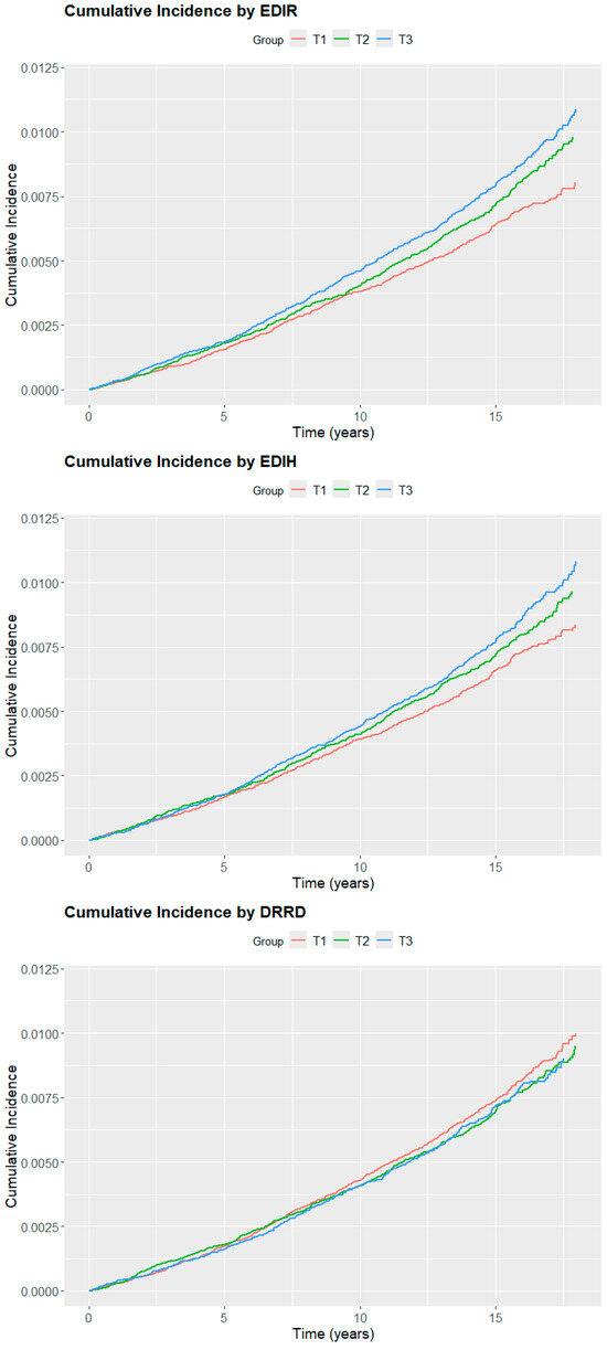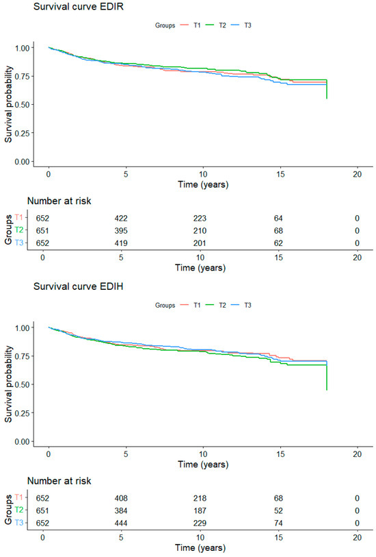 The three dietary patterns were categorized based on the analysis conducted using splines. Since the EDIH did not fit a linear model, the best representation of the data were achieved using tertiles. Conversely, the DRRD and EDIR results showed a closer fit to a linear model; however, they were also categorized into tertiles to facilitate interpretation of the results. To assess trends across tertiles, the scores were treated as continuous variables and included in the model for calculation purposes. The lowest tertile was used as the reference category for all models. The distribution of tertiles in the DRRD is not homogeneous across the three groups, as a significant number of participants have values that align with the cut-off point of the first tertile. All statistical analyses were performed using Rstudio version 4.4.2.
