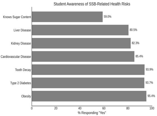 Overall, participants demonstrated high awareness of the health risks associated with frequent SSB consumption. More than 90% of students recognized the role of SSBs in contributing to obesity, type 2 diabetes, and tooth decay, while awareness of their association with cardiovascular, kidney, and liver diseases was also substantial. However, only 59% of respondents were able to correctly estimate the sugar content of SSBs, indicating a notable gap in specific knowledge. These findings are summarized in Figure 2.