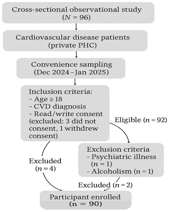 This was a single-center cross-sectional observational study. The study population was cardiovascular disease patients that were users of a private primary healthcare clinic. The convenience sampling method was used to collect data from December 2024 to January 2025. Participants who were eligible to take part in this study needed to be men or women aged 18 years and above who had been diagnosed with cardiovascular disease. Moreover, they needed to be able to read and write in Greek to ensure they could understand the study materials and take part in the related assessments effectively. Only individuals who willingly agreed to participate in this study were included in the enrollment process. As exclusion criteria, we used a history of psychiatric illness, a recent history of alcohol and/or drug abuse, dementia, and Alzheimer’s disease (Figure 1).