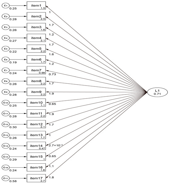 The total sample comprised 90 individuals, where 13 (14.4%) were female and 77 (85.6%) were male; the mean age was 63.8 ± 9.6 years. A total of 30 (33.3%) participants were single, divorced, or widowed, and 60 (66.7%) were married or cohabited. Regarding the education level, 21 (23.3%), 41 (45.6%), 21 (23.3%), and 7 (7.8%) participants had up to secondary education, post-secondary non-tertiary education, tertiary education, and held an MSc or PhD, respectively. A total of 24 (26.7%) participants reported a low economic level, while 50 (55.6%) and 16 (17.8%) reported middle and high economic levels, respectively. In terms of physical activity, 32 (35.6%) participants had a low level, 43 (47.8%) a middle level, and 15 (16.7%) a high level. Regarding alcohol consumption, 19 (21.1%) reported no consumption of alcohol, 55 (61.1%) moderate consumption, and 16 (17.8%) high consumption (Table 1). The CVR results for CDQ-2 showed that 100% of the items (n = 17) were acceptable, and the Cronbach’s α was 0.97. A one-factor model conducted by CFA yielded acceptable global fit indices (SRMR = 0.08, CD = 0.99, CFI = 0.99), indicating that the 17 items in the one-factor solution proposed by the principal investigators should be accepted for the Greek version of CDQ-2 (Figure 2). The mean score of CDQ-2 was 2.9 (SD = 17.2), and the mean MEDAS score was 8 (SD = 5.2). A bivariate Pearson’s correlation established that there was a strong, statistically significant linear relationship between the CDQ-2 and MEDAS scores, with r (90) = 0.962 and p < 0.001.
