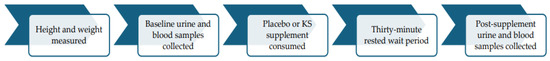 Prior to both data collection visits, participants were asked to refrain from exercise, caffeine, and nicotine for 12 h and fast for 10 h. In addition, females took a pregnancy test prior to each data collection session. All measures were the same for both data collection visits. First, height and body mass were recorded. A urine sample was then collected to determine baseline urinary AcAc levels. After the urine sample, 250 µL of blood was collected via finger pricks and then processed for subsequent baseline plasma AcAc analysis. After baseline measures, participants drank either the placebo or KS supplement, which consisted of the powder mixed in 16 ounces of water. Thirty minutes after consuming the drink, the same urine and blood AcAc measures were taken. Figure 1 displays the process that occurred in both laboratory visits.