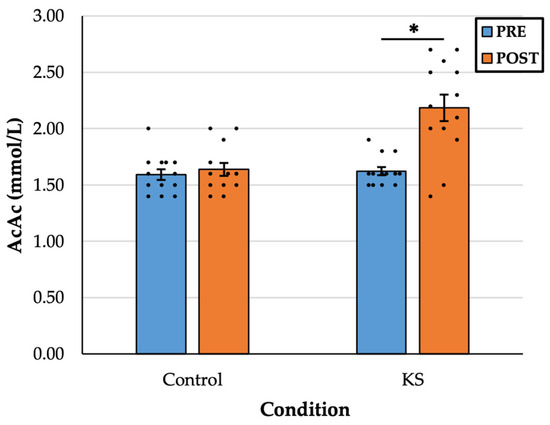 Blood concentration acetoacetate (AcAc) values before (PRE) and 30 min after (POST) the consumption of a control drink and a ketone salt (KS) supplement. Colored bars indicate sample means, whiskers indicate the corresponding standard error of the mean, and dots indicate individual data points. * = significant at the p < 0.05 level.