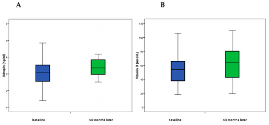 (A) Serum adropin levels in responders at baseline and after the six-month follow-up; (B) vitamin D levels in responders at baseline and after the six-month follow-up. Data are presented as medians.