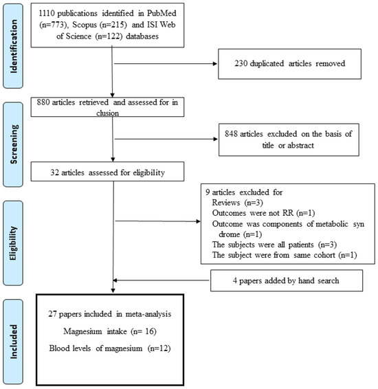 Regarding minerals, accumulating evidence has shown that a high sodium status is associated with an increased risk of metabolic syndrome [11]. Many previous observational studies have explored the risk of metabolic syndrome in relation to the intake [12,13,14,15,16,17,18,19,20,21,22,23,24,25,26,27] or blood levels [27,28,29,30,31,32,33,34,35,36,37,38] of magnesium. Although there have been previous attempts to integrate evidence on the association between magnesium intake and the risk of metabolic syndrome, most of the included studies were cross-sectional [39,40]. As several cohort studies have recently reported the results of studies on magnesium intake and metabolic syndrome [23,24,25], there is a need to integrate the prospective association between magnesium intake and metabolic syndrome. Therefore, we conducted a systematic review and meta-analysis of observational studies to summarize the evidence of the association between intake and blood levels of magnesium and metabolic syndrome.