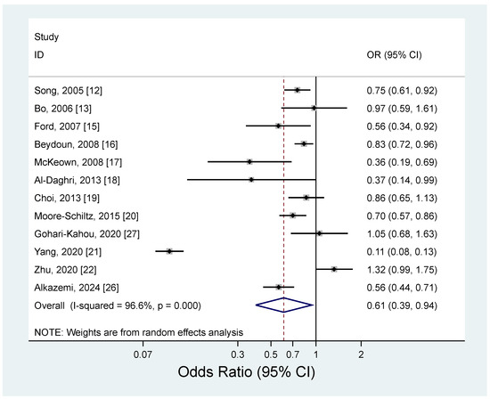 The results of the meta-analysis regarding the association between magnesium intake and metabolic syndrome by study design are shown in Figure 2 and Figure 3. The pooled RR for the prospective cohort studies was 0.79 (95% CI: 0.71–0.88), with no heterogeneity (I2 = 0.0%; p = 0.40) (Figure 2). For the cross-sectional studies, the pooled OR was 0.61 (95% CI: 0.39–0.94), and a significant heterogeneity was observed among the studies (I2 = 96.6%; p < 0.001) (Figure 3). The observed heterogeneity slightly decreased (I2 = 71.2%; p < 0.001) after excluding a study with the strongest inverse association between dietary intake and metabolic syndrome [21]. The subgroup analysis results for the cross-sectional studies are presented in Table 4. When we examined by sex, a significant inverse association between dietary magnesium and metabolic syndrome was found, but only for women (OR = 0.69; 95% CI: 0.58–0.83); men showed a non-significant inverse association (OR = 0.77; 95% CI: 0.59–1.01). However, the difference by sex was not significant (p for difference = 0.55). By geographic region, an inverse association between dietary magnesium and metabolic syndrome was significant in the United States (OR = 0.71; 95% CI: 0.60–0.84), but the difference by region was not significant (p for difference > 0.6 for all comparisons). There was no significant difference for the sample size (p for difference = 0.73) or adjustment factor (p for difference > 0.4 for all comparisons).