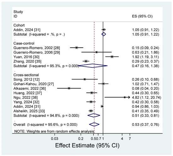 Forest plots of the observational studies of metabolic syndrome for high versus low blood magnesium levels [12,27,28,29,30,31,32,33,35,36,37,38].