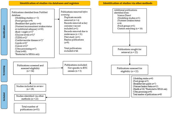 Studies published from 1 January 2004 to 16 September 2024 were evaluated. PubMed was searched to capture publications related to RTECs and the diet and health of children and adults. Science Direct was also searched to identify additional publications, excluding conference abstracts and replica publications. In many studies, RTECs are referred to as ‘breakfast cereals’; hence, both of these terms formed the basis of the search terms [26].