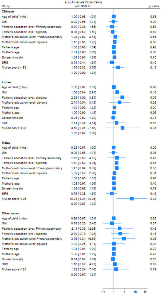 Factors associated with being overweight or obese during the pandemic in children on the autism spectrum were analyzed as shown in Table 2. Univariately, risk predictors of overweight or obesity were: Malay ethnicity (OR = 2.32, 95% CI 1.64–3.28, p < 0.01), fathers with post-secondary or diploma highest education level (OR = 1.56, 95% CI 1.10–2.20, p = 0.01), mothers with primary or secondary highest education level (OR = 1.63, 95% CI 1.05–2.55, p = 0.03), and MSEL ELC score less than 85 (OR = 2.80, 95% CI 1.53–5.15, p < 0.01); older age of child (OR = 0.99, 95% CI 0.981–0.998, p = 0.02) was a protective factor. Upon multivariate logistic regression, only Malay ethnicity remained a significant risk factor (OR = 3.29, 95% CI 1.39–7.74, p = 0.01). Table 3 shows the detailed demographic data for these variables across different ethnic groups. There are statistically significant differences in the ethnic distribution across all the other variables being examined. Compared to the ethnic distribution of our study cohort, there is a higher proportion of parents of Malay ethnicity having a lower education level, as well as a higher proportion of Malay children who are younger and having lower MSEL scores. We further performed subgroup analysis of the risk factors by ethnic group, as shown in the forest plot in Figure 2. Only within the Malay population, a lower MSEL score is a risk factor for obesity (OR = 10.3, 95% CI 1.34–79.36, p = 0.025), while older age is a protective factor against obesity (OR = 0.98, 95% CI 0.97–1.00, p = 0.046).