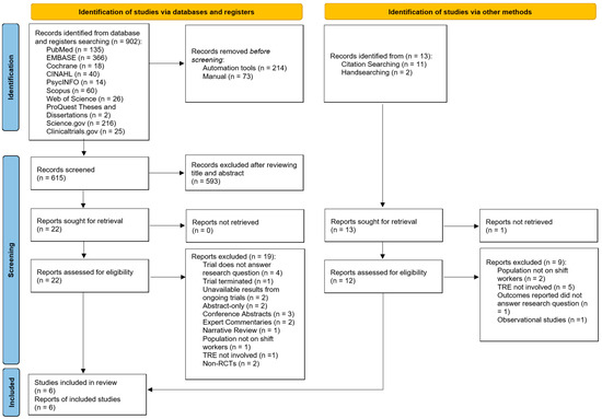 A total of 902 articles were identified from electronic database and register searches (Figure 1). After removing duplicates, 615 articles were screened by title and abstract. Of these, 593 articles were excluded, leaving 22 for full-text screening. After further exclusions based on the eligibility criteria, three studies were included. An additional 13 articles were identified through citation searching and handsearching, with three meeting the inclusion criteria after full-text screening. Hence, a total of six articles were included in this review [51,52,53,54,55,56]. Inter-rater reliability for full-text selection between two independent reviewers was in perfect agreement (κ = 0.93).