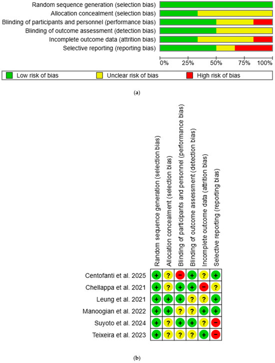 (a) Risk-of-bias graph using Cochrane RoB-1. “+” = low risk of bias, “?” = unclear risk of bias, and “−“ = high risk of bias. (b) Risk-of-bias summary using Cochrane RoB-1. “+” = low risk of bias, “?” = unclear risk of bias, and “−“ = high risk of bias [51,52,53,54,55,56].