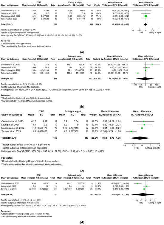 Two-hour postprandial glucose was reported in three studies with 63 participants, showing no statistically significant difference between TRE and eating at night (WMD: −0.65 mmol/L, 95% CI: −3.18 to 1.89, t = 1.10, p = 0.39). Considerable heterogeneity was found between studies (I2 = 86%, p = 0.003) (Figure 3d).