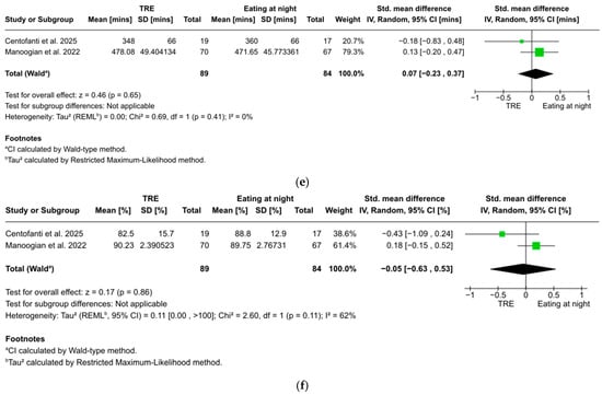 Sleep efficiency was reported in two studies with 173 participants, showing no statistically significant effect and negligible effect size of TRE on sleep efficiency (g = −0.05, 95% CI: −0.63 to 0.53, z = 0.17, p = 0.86). Substantial heterogeneity was found between studies (I2 = 62%, p = 0.11) (Figure 3f).