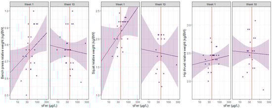 Scatterplot of the relative bench press, squat, and hip thrust strength for each individual player plotted against serum ferritin (sFer), separated by week. The purple line represents the predicted relative weight lifted by the players with, with 95% CIs in purple. The vertical red line indicates an sFer of 40 µg/L, the diagnostic cut-off used in the current study to categorize iron deficiency. The ReML analysis indicated no meaningful effect of sFer on any strength measure on a linear scale. There were modest effects of sFer on bench press (0.1 kg/BW; 95% CI 0.0 to 0.1) and squat (0.2 kg/BW; 95% CI 0.0 to 0.5) on a logarithmic scale. Marginal r-squared values indicated very weak to moderate correlations between each strength assessment and the moderating variables (i.e., sFer and week). Conditional r-squared values indicated weak to very strong associations when accounting for the random effect (athlete).