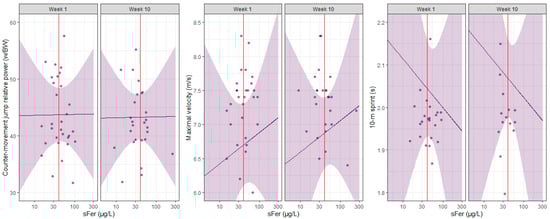 Scatterplot of counter-movement jump relative power, maximal velocity, and 10-m sprint performance for each individual player plotted against serum ferritin (sFer), separated by week. The purple line represents the predicted performance by the players, with 95% CIs in purple. The vertical red line indicates an sFer of 40 µg/L, the diagnostic cut-off used in the current study to categorize iron deficiency. The ReML analysis indicated a modest effect of sFer on all the power and speed measures. There was an estimated improvement of 0.2 W/BW (95% CI: −1.0 to 1.4) for counter-movement jump performance for every one-unit increment in sFer. Similarly, sFer had a predicted effect of 0.2 m/s (95% CI: −0.3 to 0.8) on maximal velocity and −0.4 s (95% CI: −1.1 to 0.4) on 10-m sprint performance. Marginal r-squared values indicated very weak to moderate correlations between each strength assessment and the moderating variables (i.e., sFer, week, hip thrust, squat, counter-movement jump relative power). Conditional r-squared values indicated weak to very strong associations when accounting for the random effect (athlete).