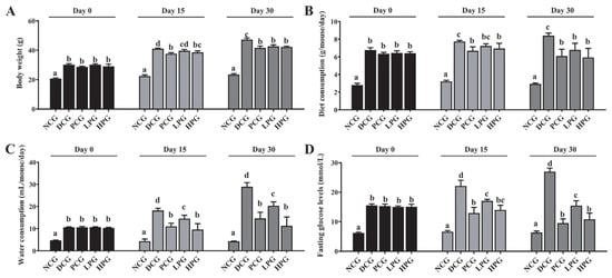 Effect of LLPK treatment on (A) body weight, (B) diet consumption, (C) water consumption, and (D) FBG in db/db mice (the letter superscripts indicate the significant differences among samples based on ANOVA analysis, p < 0.05).