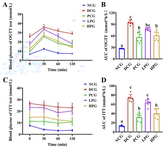 Effect of LLPK treatment on the glycemic homeostasis of db/db mice. (A) OGTT curves, (B) AUCs of OGTT, (C) ITT curves, and (D) AUCs of ITT (the letter superscripts indicate the significant differences among samples based on ANOVA analysis, p < 0.05).