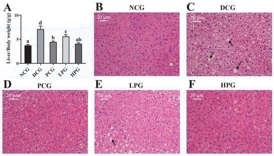 Effect of LLPK treatment on (A) liver/body weight and (B–F) liver histopathological injury of db/db mice (the letter superscripts indicate the significant differences among samples based on ANOVA analysis, p < 0.05, and the black arrows represent fatty degeneration).