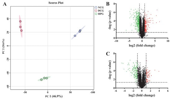 The effect of LLPK treatment on the hepatic proteome in db/db mice. (A) PCA analysis based on proteomics, (B) volcano plot between the NCG and DCG, and (C) volcano plot between the HPG and DCG (The green and red dots indicate down-regulated expression and up-regulated expression, respectively).