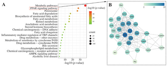 To further elucidate the potential mechanism of action of LLPK in ameliorating hepatic lipid accumulation in db/db mice, we performed a KEGG pathway analysis on DEPs between HPG and DCG. The 20 most significantly enriched KEGG pathways among the DEPs between HPG and DCG are presented in Figure 5A. It was noteworthy that a significant number of DEPs were involved in pathways associated with metabolic processes. Notably, fatty acid degradation and fatty acid metabolism were predominant, particularly highlighting the PPAR signaling pathway. Consequently, we performed a protein–protein interaction (PPI) network analysis on these 28 DEPs enriched in the PPAR signaling pathway using the online analytical tool String. Finally, we obtained a PPI network graph containing 28 nodes and 161 degrees, as illustrated in Figure 5B.