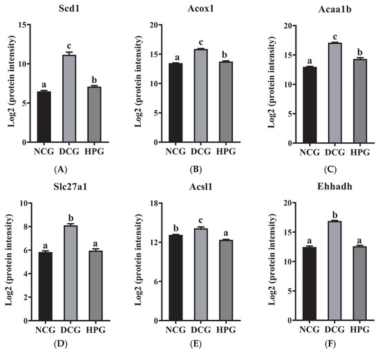 The log2 protein intensity of (A) Scd1, (B) Acox1, (C) Acaa1b, (D) Slc27a1, (E) Acsl1, and (F) Ehhadh from the hepatic proteome (the letter superscripts indicate the significant differences among samples based on ANOVA analysis, p < 0.05).