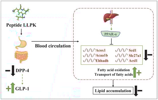 Overexpression of Scd1 could induce metabolic issues such as IR and T2DM [23]. The present work revealed that Scd1 expression levels were markedly elevated in db/db mice, which were consistent with previous findings [24,25]. Notably, db/db mice treated with LLPK exhibited a significant decline in the hepatic Scd1 level. A prior investigation by Görgens et al. demonstrated that targeted silencing of hepatic DPP-4 expression led to a substantial reduction in hepatic Scd1 mRNA levels [24]. It was therefore hypothesized that LLPK may decrease hepatic Scd1 expression by inhibiting the expression or activity of hepatic DPP-4, thereby ameliorating hepatic lipid accumulation. On the other hand, Acox1, Acaa1b, and Ehhadh are key proteins involved in fatty acid oxidation [26,27,28]. A recent report indicated that a high-fat diet could induce elevated mRNA levels of Acox1 in mouse liver [26]. Meanwhile, specific knockdown of hepatic Acox1 expression prevented obesity, IR, and related complications in mice with HFD [26]. He et al. [29] reported a similar finding, who demonstrated that a high-fat diet increased hepatic Acox1 gene expression. However, hepatic Acox1-LKO was shown to induce fat autophagy, thereby preventing fatty liver [29]. Although studies on the mechanisms by which active peptides regulate Acaa1b and Ehhadh and thereby affect lipid metabolism are scarce, some research regarding the bioactivity of other active compounds have been published. A recent study demonstrated that dark tea extract could ameliorate glycolipid metabolism disorders in db/db mice by mediating the expression of key factors in the PPAR signaling pathway, such as Ehhadh and Fabp1 [30]. Similarly, this study revealed a notable reduction in hepatic Acox1, Acaa1b, and Ehhadh expression levels of db/db mice following LLPK treatment (Figure 6). It can therefore be postulated that the regulation of fatty acid oxidation may serve as a key mechanism through which LLPK exerts its beneficial effects on lipid metabolism disorders.