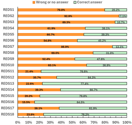 Percentage of correct and incorrect responses to the RED-S knowledge questionnaire among gymnasts (n = 84).