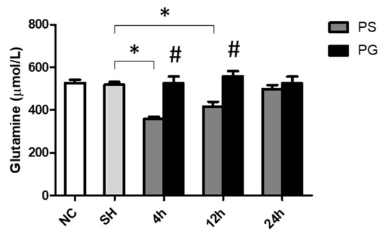 There were no differences in plasma GLN levels between the NC and SH groups. However, the PS group had lower GLN levels than the SH group at 4 and 12 h. Additionally, PG showed significantly higher GLN levels than the PS group at both time points (Figure 1).