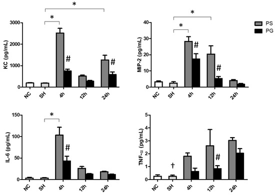The sham operation did not increase the levels of inflammatory cytokines in the plasma. After poly(I:C) stimulation, the concentrations of KC were significantly increased at 4 and 24 h, IL-6 at 4 h, MIP-2 at 4 and 12 h, and TNF-α at all time points. GLN administration significantly decreased the levels of these parameters (Figure 2).