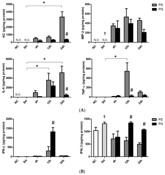 The sham operation did not affect chemokines and cytokines levels in the BALF. Poly(I:C) stimulation significantly increased the concentrations of KC at 24 h, MIP-2 at all three time points, IL-6 at 12 and 24 h, and TNF-α at 12 h compared to those of the SH group. The PG group had significantly lower KC and IL-6 levels at 24 h and TNF-α at 12 h than those in the PS groups after poly(I:C) stimulation (Figure 3A). Compared to the SH group, IFN-λ3 levels were lower at all time points after poly(I:C) stimulation. For groups treated with poly(I:C), the PG group had higher levels of IFN-β at 12 h and IFN-λ3 at 12 and 24 h than the PS groups (Figure 3B).