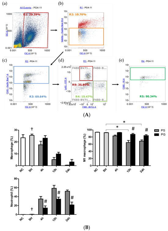 An illustration of the strategy for gating leukocytes, macrophages, and neutrophils in flow cytometry is shown in Figure 4A. The R1 region indicated that the cells were gated to eliminate debris. Next, live cells were selected using a cell viability dye from the R1 region, as shown in the orange square in panel (b). In panel (c), the antibody CD45 was utilized to identify leukocytes among the live cells, with the blue square highlighting CD45+ cells. Subsequently, Ly6G and F4/80 antibodies were applied to gate neutrophils (CD45+/Ly6G+) and macrophages (CD45+/F4/80+) in panel (d), respectively. Finally, panel (e) displays the CD45.2+/F4/80+/CD80+ cells that were selected from the CD45+/F4/80+ population identified in panel (d). The percentages of macrophages were significantly lower at all time points in the PS group compared to the SH group; however, there were no significant differences between the PS and PG groups at each time point. The population of M1 macrophages in the SH group was significantly higher than that in the PS group at 12 and 24 h. Nevertheless, at 12 and 24 h, the percentage of M1 macrophages in the PS group was lower than that in the PG group after poly(I:C) stimulation. In contrast, the percentages of neutrophils were significantly elevated following poly(I:C) stimulation. Compared to the PS group, the percentages of neutrophils in the PG group decreased after poly(I:C) stimulation (Figure 4B).
