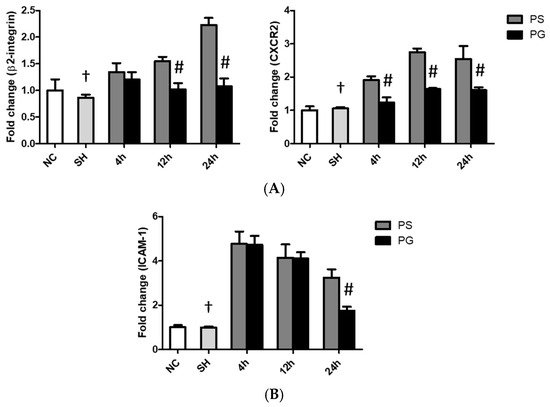 Messenger (m)RNA expressions of leukocyte migration-related factors in (A) leukocytes, (B) endothelial cells, and (C) epithelial cells of the lungs. NC group, the normal control group; SH group, intratracheally administered saline; PS group, administered poly(I:C) intratracheally and an IV injection of saline; PG group, administered poly(I:C) intratracheally and an IV injection of glutamine. CD47, cluster of differentiation 47; CXCR2, C-X-C motif chemokine receptor 2; ICAM-1, intercellular adhesion molecule-1. Data are expressed as the mean ± standard error of the mean (SEM). The differences between the NC and SH groups were analyzed using Student’s t-test. A two-way analysis of variance (ANOVA) followed by a Bonferroni post-hoc test was used to analyze the differences among the SH and PS groups at three time points and between the PS and PG groups at identical time points. † Significantly different from the PS group at three time points (p < 0.05). # Significantly different from the PS group at the identical time point (p < 0.05).