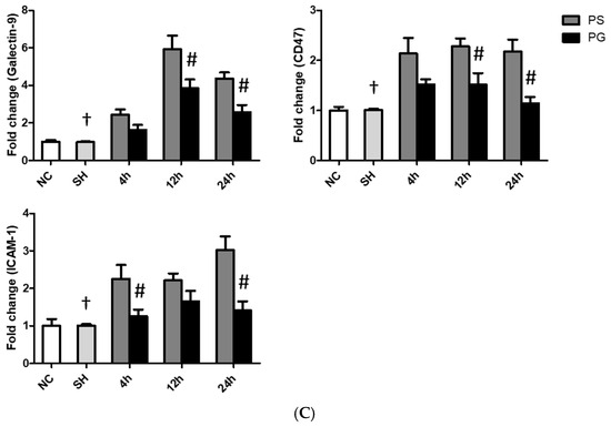 The sham operation had no impact on the mRNA expression of migration indicators compared to the PS group across all time points. mRNA expressions of β2-integrin and CXCR2 in leukocytes, ICAM-1 in endothelial cells, and galectin-9, CD47, and ICAM-1 in epithelial cells in the PS group were significantly higher than those in the SH group at all three time points. Compared to the PS group, all these factors were significantly downregulated in the PG group at some or all three of the time points after poly(I:C) stimulation (Figure 5).