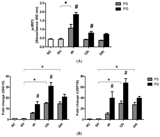 After stimulation with poly(I:C), the protein levels of p-IRF3 were significantly higher in the PS group compared to the SH group at 4 h. Compared to the PS group, the PG group at both 4 and 12 h showed a significant increase (Figure 6A). Additionally, the mRNA expression of ISG15 in the PS group was significantly upregulated compared to the SH group at both 12 and 24 h. The mRNA expression of USP18 also increased at 12 and 24 h post-poly(I:C) induction compared to that in the SH group. In contrast, ISG15 and USP18 were significantly upregulated in the PG group at 4 and 12 h when compared to the PS group (Figure 6B).