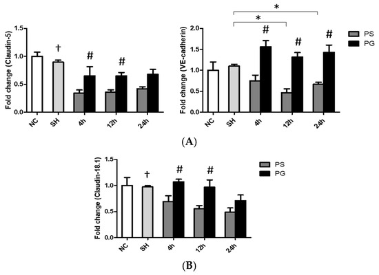 Messenger (m)RNA expressions of tight/adherens junction proteins in (A) endothelial and (B) epithelial cells of lung tissues. NC group, the normal control group; SH group, intratracheally administered saline; PS group, administered poly(I:C) intratracheally and an IV injection of saline; PG group, administered poly(I:C) intratracheally and an IV injection of glutamine. VE-cadherin, vascular endothelial cadherin. Data are expressed as the mean ± standard error of the mean (SEM). The differences between the NC and SH groups were analyzed using Student’s t-test. A two-way analysis of variance (ANOVA) followed by a Bonferroni post-hoc test was used to analyze the differences among the SH and PS groups at three time points and between the PS and PG groups at identical time points. † Significantly different from the PS group at three time points (p < 0.05). * Significantly different from the SH group (p < 0.05). # Significantly different from the PS group at the identical time point (p < 0.05).