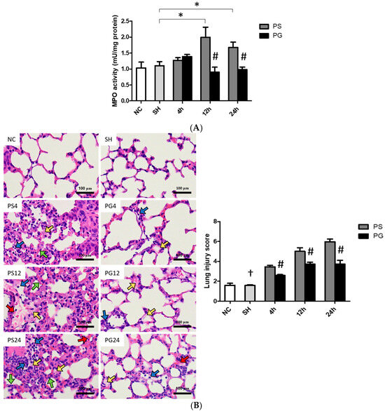 (A) Myeloperoxidase (MPO) activities, (B) representative images of hematoxylin and eosin (H&E) staining (magnification, ×400), and histopathology scores of lung tissues. Blue, yellow, red, and green arrows represent immune cell infiltration, alveolar or interstitial edema, hemorrhage, and septal thickening, respectively. NC group, the normal control group; SH group, intratracheally administered saline; PS group, administered poly(I:C) intratracheally and an IV injection of saline; PG group, administered poly(I:C) intratracheally and an IV injection of glutamine. Data are expressed as the mean ± standard error of the mean (SEM). The differences between the NC and SH groups were analyzed using Student’s t-test. A two-way analysis of variance (ANOVA) followed by a Bonferroni post-hoc test was used to analyze the differences among the SH and PS groups at three time points and between the PS and PG groups at identical time points. † Significantly different from the PS group at three time points (p < 0.05). * Significantly different from the SH group (p < 0.05). # Significantly different from the PS group at the same time point (p < 0.05).