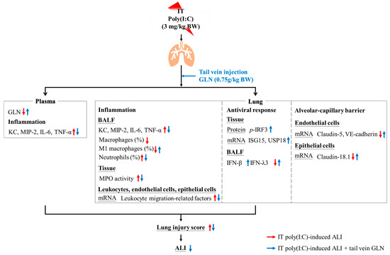 Illustration of the potential mechanisms of glutamine (GLN) administration after poly(I:C) stimulation. The red arrow indicates the effects of poly(I:C) stimulation, while the blue arrow illustrates the effects of GLN administration following poly(I:C) stimulation. ALI, acute lung injury; BW, body weight; GLN, glutamine; IFN-β, interferon-β; IFN-λ3, interferon-λ3; IL-6, interleukin-6; ISG15, interferon-stimulated gene 15; IT, intratracheal injection; KC, keratinocyte-derived chemokine; MIP-2, macrophage inflammatory protein-2; p-IRF3, phosphorylated interferon-regulatory factor 3; MPO, myeloperoxidase; TNF-α, tumor necrosis factor-α; USP18, ubiquitin specific peptidase 18; VE-cadherin, vascular endothelial cadherin.