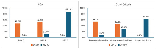 The proportion of patients with malnutrition according to the SGA or GLIM criteria decreased from 100% to 11.8% and 36.4%, respectively (p < 0.00001 in both cases). The proportion of severe malnutrition decreased from 47.9% to 0% (p < 0.00001) by SGA (SGA C), and from 54.2% to 8.2% (p < 0.00001) by GLIM (Figure 1).