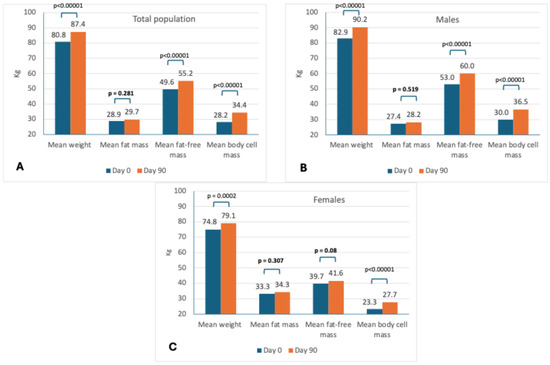 Main changes in body composition by BIA in the total population (A), males (B), and females (C).