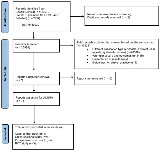 Overall, 30,930 records were identified from Google Scholar, Scopus, and EMBASE (MEDLINE and PubMed) databases that explored the association between maternal adherence to MD and pregnancy and birth outcomes. After removing duplicates, 30,928 studies were screened based on title and abstract. A total of 30,921 records were excluded for the reasons specified in the PRISMA flowchart (refer to Figure 1). Finally, full-text versions of the seven studies that explored the association between MD adherence in pregnancy and risks of preeclampsia, GDM, and/or eGWG were retrieved and included in the current systematic review.