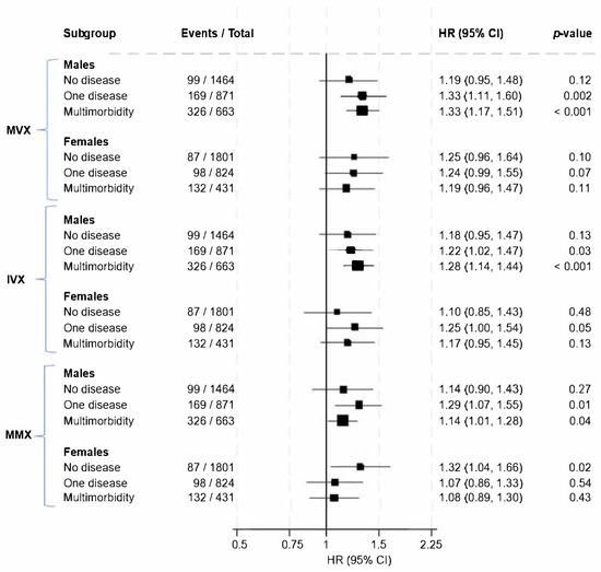 The associations were similar in age subgroups (Supplementary Material E). Figure 1 shows the associations of MVX, IVX, and MMX with mortality in each multimorbidity category in males and females. The associations appeared to be stronger in males, particularly among those with existing chronic disease, whereas in females, the associations appeared to be more pronounced in those without chronic conditions. However, estimation of RHRs showed no statistically significant evidence that sex modified the associations of MVX, IVX, and MMX with mortality risk in each multimorbidity category (Table 3).