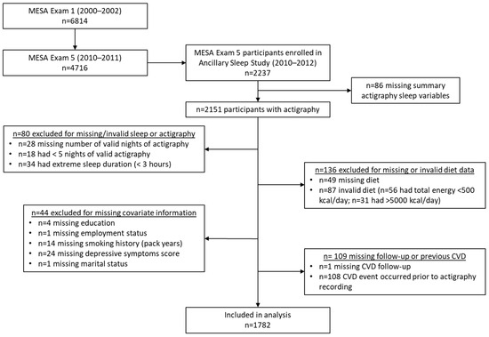 The Multi-Ethnic Study of Atherosclerosis (MESA) is a longitudinal community-based cohort investigating cardiovascular risk. The first visit (2000–2002) enrolled 6814 participants aged 45–84 years with no history of CVD from six U.S. sites (Baltimore, MD; Chicago, IL; Forsyth County, NC; Los Angeles, CA; New York, NY; St. Paul, MN). The baseline racial and ethnic distribution was 38% White, 28% Black, 22% Hispanic/Latino, and 12% Chinese individuals [29]. There have been 7 exams, and participants are actively followed for cardiovascular events. At Exam 5 (2010–2012), 4716 participants completed a dietary assessment, and those not using oral devices, nocturnal oxygen, or positive airway pressure were invited to join the MESA Sleep Study. Among 3789 eligible participants, 2237 enrolled, completing 7-day actigraphy and standardized sleep questionnaires [30]. This analysis excluded those with missing summary sleep measures (n = 86), <5 (n = 18) or missing (n = 28) number of valid nights, <3 h average sleep duration (n = 34), missing or invalid diet (n = 136), or missing covariates (n = 54) (Figure 1). Additionally,108 were excluded for having a CVD event prior to the sleep exam, and 1 person was lost to follow-up, leaving 1782 participants for this analysis. All participants provided written informed consent at each visit, and the methods were approved by institutional review boards at each site.