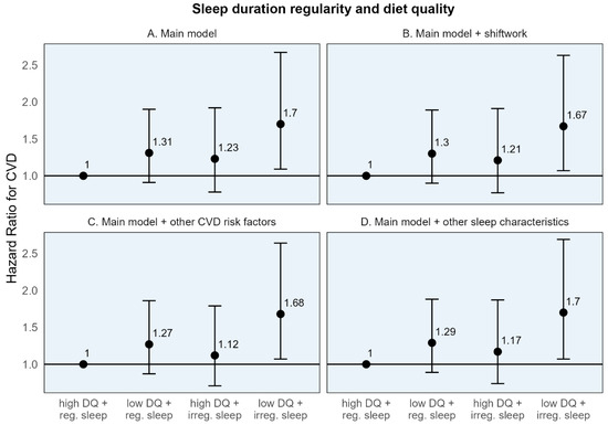 Adjusted hazard ratios and 95% confidence intervals for incident cardiovascular disease for sleep duration regularity, diet quality, and their joint effect compared to a common reference group. CVD: Cardiovascular disease. High diet quality (high DQ): AHEI-2010 ≥ median value; low diet quality (low DQ): AHEI-2010 < median value. Regular sleep timing (reg. sleep): SD sleep onset time < 60 min; irregular sleep timing (irreg. sleep): SD sleep onset time ≥ 60 min. (A) Main model adjusted for age, sex, race/ethnicity + total energy intake (kcal/d; diet models only), height (cm; diet models only), education (<high school, high school degree, some college, and bachelor’s degree or higher), employment status (employed/unemployed), marital status (currently married/single, divorced, and widowed), study site, season of actigraphy recording (sleep models only; winter, spring, summer, and fall) + physical activity (self-report, MET-hours per week), smoking history (pack-years), depressive symptoms (CES-D ≥ 16). (B) Sensitivity model additionally adjusting for shiftwork. (C) Sensitivity model additionally adjusting for CVD risk factors: BMI, HbA1c, non-HDL cholesterol, and systolic blood pressure. (D) Sensitivity model additionally adjusting for other sleep characteristics: insomnia symptoms, chronotype, excessive daytime sleepiness, and average sleep duration.