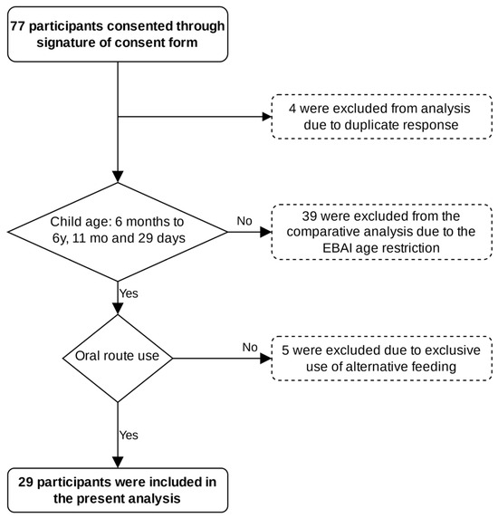 The EBAI is a self-report questionnaire consisting of 14 items and is interpreted by the T-score result, classifying difficulties as mild, moderate, and severe, presenting feeding difficulties when the T-score is greater than 60 [23,32]. Participants included in the study were required to be within the age range of 6 months to 6 years and 11 months, as the EBAI is a validated tool specifically designed for this age group [32]. At the time of data collection, no validated instrument was available for older children with similar feeding concerns. Although clear inclusion criteria were provided, the survey was self-administered by parents or caregivers—laypersons who may not have fully adhered to the written instructions. As a result, some responses fell outside the intended age range. These cases were excluded from the analysis to ensure methodological consistency and compliance with the tool’s validated parameters.