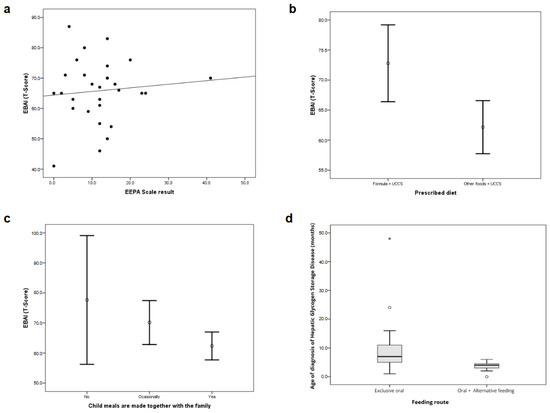 (a) Comparison between the results of EBAI and EEPa scales (Spearman correlation). (b) Comparison between EBAI results and prescribed diet (t-Student test). (c) Comparison between EBAI scale results and whether the child has meals with the family (t-Student test). (d) Comparison of age at diagnosis of hepatic GSD with feeding route. Asterisks in (d) indicate outlier data points.